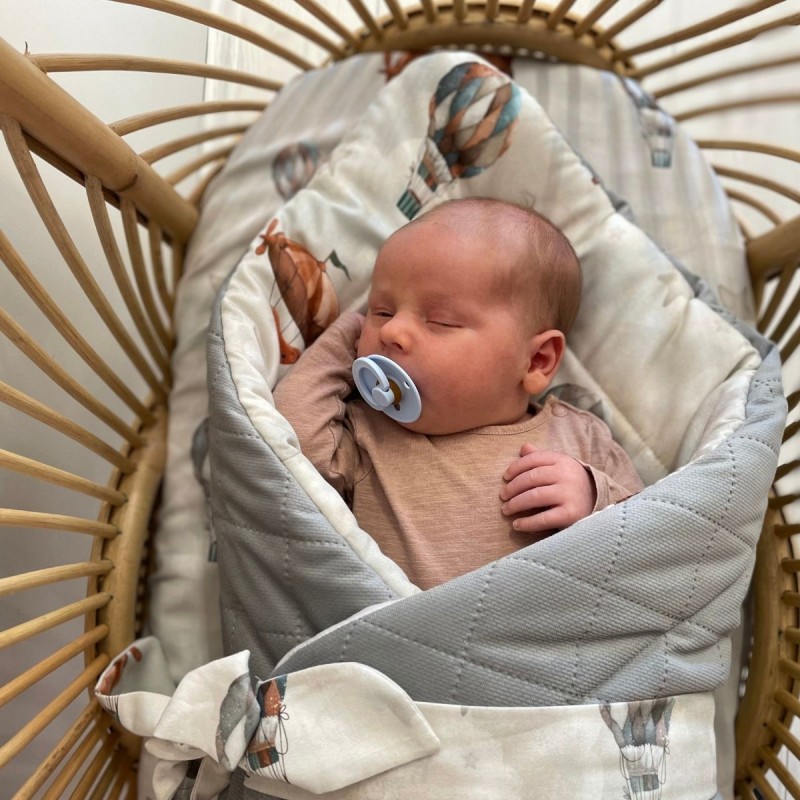 Rożek dla niemowlaka Up in the Air z jednej strony wykonany został z miękkiej i delikatnej bawełny, zadrukowanej autorskim wzorem. Z drugiej uszyty został z wysokiej jakości, mięciutkiej dzianiny Velvet.